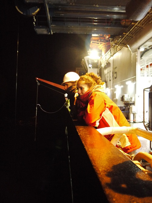 We had an astonishing display of dolphins last night. While sat carrying out a couple of measurements with the CTD for the iron work, lots of small fish had been attracted to the ship probably because of the deck lights. They in turn attracted something like 40-50 dolphins, cruising up and down the ship, accelerating to chase fish, and leaping out of the water to catch fish that were trying to escape. The acceleration and the rate at which the dolphins could turn through 180 degrees were incredible to watch. [A good question for the Oceans Sciences and Marine Biology students back at Liverpool University - the dolphins were reaching easily 10 metres per second, what Reynolds number were they operating at?] With the light from the ship we could see the dolphins 2 or 3 metres below the surface, streaking along after their food. Two sharks also turned up for the feast - much more sedate than the dolphins, cruising slowly into the foray and just wandering about as the dolphins flashed around them. We got a good look at one of them as it passed right below us at the side of the ship - at least 2 metres long. Dolphins and sharks paid each other no attention at all. This whole theatre lasted a good 90 minutes. My camera wasn’t quite up to the task of night-time photography, but the best effort is below.